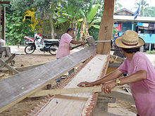 The use of wood as a tenon can be traced back over 7,000 years, as archaeologist have found traces of wood nails in the excavation of early Germanic sites.[2] Trenails are extremely economical and readily available, making them a common early building material.[3] Black Locust is a favorite wood when making trunnels in shipbuilding in North America[4] [5] and English Oak in Europe[6] [7] due to their strength and rot resistance, while red oak is typical in buildings. Traditionally treenails and pegs were made by splitting bolts of wood with a froe and shaping them with a drawknife on a shaving horse. Treenails are cut from a single piece of wood and perform well because of the natural grain. The grain of the treenail runs perpendicular to the grain of the receiving mortises which adds structural strength. Treenails are typically 1.25–1.5 inches (32–38 mm) in diameter and are hand whittled with rough facets. The mortise is drilled 1&fras1;16 inch (1.6 mm) smaller than the treenail to create a tight fit and take advantage of friction in the mortise. In cases where the treenail is 24 inches (61 cm) or longer, the treenail should be shaped 1&fras1;8 inch (3.2 mm) smaller than the other half. In the same case the mortise is drilled in two parts, with a smaller auger for the smaller part of the treenail and a typical auger for the standard part. Other trenails are tapered with the large end being 1&fras1;8 inch (3.2 mm) longer than the mortise. After treenails are hammered into the mortise, they can be trimmed, split, and wedged with a small piece of oak that increases friction force.[8] As an alternative to the wedge, the treenail can receive a plug or a punch to the center that expands the entire circumference. While this method prevents leaks by reducing gaps, plugs and punches are more likely to fall out in cold temperatures. Ideally, the nose of the treenail is driven 4–5 cm clear of the timber before being trimmed.[9] Unlike metal nails, trenails can not be removed (without great effort) or reused. As the wood shrinks or expand the fibers create a friction that interlocks it into the mortise snugly. If a treenail breaks or fails but the wood it is fastening remains intact the remaining trenail can be cut out and replaced with a larger treenail that fits snugly. In addition, treenails have the ability to move over time and retain structural integrity. Because both the mortise and the tenon are wood, the trenail does not stress the mortise to the point of failure during movement including seismic forces and grade settlement.