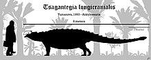 Tsagantegia (/ˌsɑːɡɑːnˈteɪɡiə/; meaning Tsagan Teg) is a genus of medium-sized ankylosaur thyreophoran dinosaur that lived in Asia during the Late Cretaceous period. The genus is monotypic, including only the type species, T. longicranialis. The specimen consists of a very partial individual, comprising the skull and lacking postcranial remains. Since it only preserves the skull, Tsagantegia is mainly characterized by its elongated snout and the flattened facial osteoderms, greatly differing from other ankylosaurs.