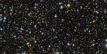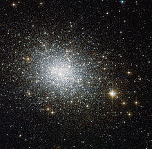 The second-brightest globular cluster in the sky after Omega Centauri, 47 Tucanae (NGC 104) lies just west of the Small Magellanic Cloud. Only 14,700 light-years distant from Earth, it is thought to be around 12 billion years old.[13] Mostly composed of old, yellow stars, it does possess a contingent of blue stragglers, hot stars that are hypothesized to form from binary star mergers.[48] 47 Tucanae has an apparent magnitude of 3.9, meaning that it is visible to the naked eye; it is a Shapley class III cluster, which means that it has a clearly defined nucleus. Near to 47 Tucana on the sky, and often seen in wide-field photographs showing it, are two much more distant globular clusters associated with the SMC: NGC 121, 10 arcminutes away from the bigger cluster's edge, and Lindsay 8.[49]