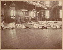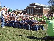 Although the university hosted an unrelated freshman vs. sophomores tug of war event in the 1910s and 1920s, the first record of modern Puddle Pull is its appearance as a tug of war event in the school's newspaper, The Miami Student, in May 1949.[26] This fraternity event was created by Frank Dodd of the Miami chapter of Delta Upsilon. Originally, the event was held as a standing tug of war over the Tallawanda stream near the Oxford waterworks bridge in which the losers were pulled into the water.[27] This first event was later seen as a driving force for creating interfraternity competitive activities (Greek Week) at Miami University.[28] As a part of moving to a seated event, a new rule was created in 1966 to prohibit locks and created the event that is seen today with the exception of a large pit that was still being dug in between the two teams.[29][30] The event is held in a level grass field and uses a 2-inch diameter rope that is at least 50 feet long is used for the event. Footholes or "pits" are dug for each participant at 20-inch intervals. The pits are dug with a flat front and an angled back. Women began to compete sporadically starting in the 1960s and became regular participants as sorority teams in the mid-1980s.