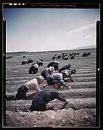 The Tule Lake National Monument[4] in Modoc and Siskiyou counties in California, consists primarily of the site of the Tule Lake War Relocation Center, one of ten concentration camps constructed in 1942 by the United States government to incarcerate Japanese Americans forcibly removed from their homes on the West Coast. They totaled nearly 120,000 people, more than two-thirds of whom were United States citizens.