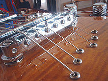 Tune-o-matic (also abbreviated to TOM) is the name of a fixed or floating bridge design for electric guitars. It was designed by Ted McCarty (Gibson Guitar Corporation president) and introduced on the Gibson Super 400 guitar in 1953 and the Les Paul Custom the following year.[1] In 1955, it was used on the Gibson Les Paul Gold Top. It was gradually accepted as a standard on almost all Gibson electric guitars, replacing the previous wrap-around bridge design, except on the budget series.[2]