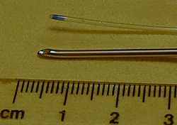 A 16G Portex Tuohy needle and epidural catheter. Large rule marks 1 cm apart. | |