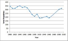 Variations in the population of Tur Langton, although potentially caused by natural birth and death rates, may be a consequence of its changes in classification. Before 1866, Tur Langton was classified as either a 'township' or 'chapelry' within the Church Langton parish of Leicester County, in the ancient hundred of Gartree, in the southern section of the county. Upon the opening of St Andrews church, Tur Langton was granted a modern civil parish classification.[6] These changes in classification could have altered the physical boundaries of what was seen to be Tur Langton which, in turn, may have affected population counts; for example, the population dropping under the 300 mark after the classification change in 1866. Other peaks or dips in population from this date on are most likely due to either natural variations in birth and death rates or further minor boundary changes.