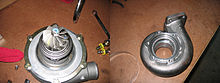A turbocharger, colloquially known as a turbo, is a turbine-driven, forced induction device that increases an internal combustion engine's power output by forcing extra compressed air into the combustion chamber.[1][2] This improvement over a naturally aspirated engine's power output is because the compressor can force more air—and proportionately more fuel—into the combustion chamber than atmospheric pressure (and for that matter, ram air intakes) alone.