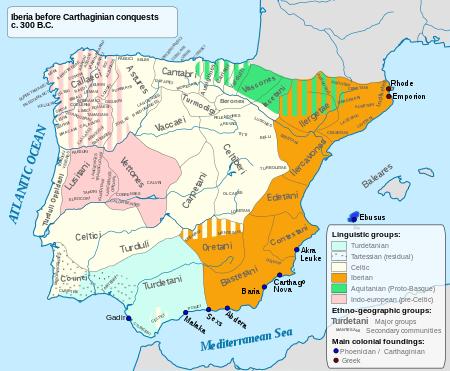 An off-shot of the Turduli people, the Turduli Oppidani trekked northwards around the 5th century BC in conjunction with the Celtici[2][3][4] and ended settling the present-day central coastal Portuguese Estremadura-Beira Litoral Province. The Oppidani seem to have become clients of the Lusitani sometime prior to the mid-3rd Century BC and then of Carthage at the latter part of the century. Their history after the 2nd Punic War is less clear; is it almost certain that the Oppidani remained under Lusitani overlorship and bore the brunt of the first Roman thrusts into the Iberian northwest. In 138-136 BC Consul Decimus Junius Brutus devastated their lands in retaliation for them helping the Lusitani.[5] The Oppidani were certainly defeated and technically included in Hispania Ulterior province by the praetor Publius Licinius Crassus in the wake of his campaign against the Lusitani and Celtici in 93 BC. Again the Turduli Oppidani and the Turduli Veteres suffered the same treatment in 61-60 BC, when they were incorporated into H. Ulterior by the Propraetor Julius Caesar.[6]