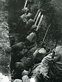 Turkish soldiers in a trench waiting for the order to attack with fixed bayonets on their rifles