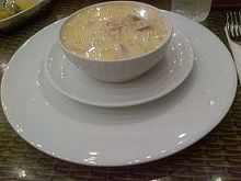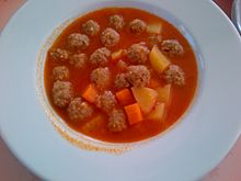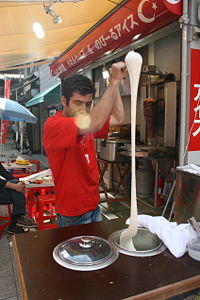 Yoğurt is an important element in Turkish cuisine.[4] In fact, the English word yogurt or yoghurt derives from the Turkish word yoğurt. Yoğurt can accompany almost all meat dishes (kebabs, köfte), vegetable dishes (especially fried eggplant, courgette, spinach with minced meat etc.), meze and a specialty called mantı (folded triangles of dough containing minced meat). In villages, yoğurt is regularly eaten with pilav or bread. A thicker, higher-fat variety, süzme yoğurt or "strained yogurt", is made by straining the yoğurt curds from the whey. One of the most common Turkish drinks, ayran, is made from yoğurt. Also, yoğurt is often used in the preparation of cakes, some soups and pastries.