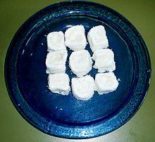 The Turkish names lokma and lokum are derived from the Arabic word luqma(t) and its plural luqūm meaning "morsel" and "mouthful"[6] and the alternative Ottoman Turkish name, rahat-ul hulküm,[7] was an Arabic formulation, rāḥat al-hulqūm, meaning "comfort of the throat", which remains the name in formal Arabic.[8] In Libya, Saudi Arabia, Algeria and Tunisia it is known as ḥalqūm, while in Kuwait it is called كبده الفرس "kabdat alfaras;" in Egypt and Lebanon it is called malban (ملبن [ˈmælbæn]) or ʕagameyya, and in Syria rāḥa. Its name in various Eastern European languages comes from Ottoman Turkish lokum or rahat-ul hulküm. Its name in Greek, λουκούμι (loukoumi) shares a similar etymology with the modern Turkish and it is marketed as Greek Delight. In Cyprus, where the dessert has protected geographical indication (PGI),[9][10] it is also marketed as Cyprus Delight. In Armenian it is called lokhum (լոխում). Its name in Bosnia and Herzegovina and Israel is rahat lokum, and derives from a very old confusion of the two Ottoman Turkish names found already in Ottoman Turkish;[7] indeed this mixed name can also be found in Turkey today. Its name in Serbo-Croatian is ratluk (ратлук), a reduced form of the same name. In Persian, it is called rāhat-ol-holqum (Persian: راحت الحلقوم).[11]