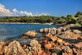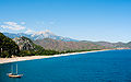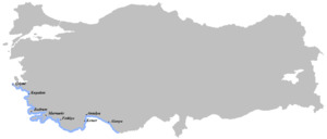 The Turkish Riviera (Turkish: Türk Rivierası), also known popularly as the Turquoise Coast, is an area of southwest Turkey encompassing the provinces of Antalya and Muğla, and to a lesser extent Aydın, southern İzmir and western Mersin. The combination of a favorable climate, warm sea, mountainous scenery, fine beaches along more than a thousand kilometers of shoreline along the Aegean and Mediterranean waters, and abundant natural and archaeological points of interest makes this stretch of Turkey's coastline a popular national and international tourist destination.