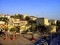 A street in Kaş with traditional houses and a Lycian tomb in the background