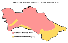 Turkmenistan is in a temperate desert zone with a dry continental climate. Remote from the open sea, with mountain ranges to the south and southeast, Turkmenistan's climate is characterized by low precipitation, low cloudiness, and high evaporation. Absence of mountains to the north allows cold Arctic air to penetrate southward to the southerly mountain ranges, which in turn block warm, moist air from the Indian Ocean. Limited winter and spring rains are attributable to moist air from the west, originating in the Atlantic Ocean and Mediterranean Sea.[70] Winters are mild and dry, with most precipitation falling between January and May. The Kopet Dag Range receives the highest level of precipitation.