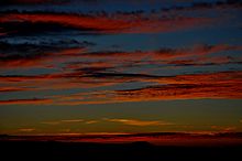 Twilight on Mars is longer than on Earth, lasting for up to two hours before sunrise or after sunset. Dust high in the atmosphere scatters light to the night side of the planet. Similar twilights are seen on Earth following major volcanic eruptions.[18]
