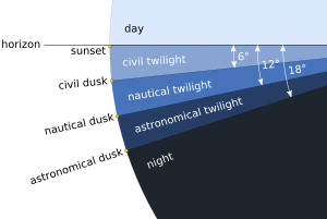 Astronomical dawn is the moment when the geometric center of the Sun is 18 degrees below the horizon in the morning. Astronomical dusk is the moment when the geometric center of the Sun is 18 degrees below the horizon in the evening. After astronomical dusk and before astronomical dawn, the sky is not illuminated by the sun.[3][4][5][2]