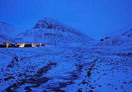 Characteristic polar night blue twilight, Longyearbyen, Svalbard, located at 78° north