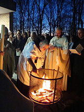 In Christian practice, "vigil" observances often occur during twilight on the evening before major feast days or holidays. For example, the Easter Vigil is held in the hours of darkness between sunset on Holy Saturday and sunrise on Easter Day — most commonly in the evening of Holy Saturday or midnight — and is the first celebration of Easter, days traditionally being considered to begin at sunset.
