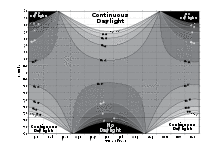 Solar Noon at Civil Twilight during a polar night: Between 67°24' and 72°34' North or South.