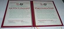 A sister city or twin town relationship is a form of legal or social agreement between two geographically and politically distinct localities for the purpose of promoting cultural and commercial ties.[1] The modern concept of town twinning, conceived after the Second World War in 1947, was intended to foster friendship and understanding among different cultures and between former foes as an act of peace and reconciliation,[2][3] and to encourage trade and tourism.[1] By the 2000s, town twinning became increasingly used to form strategic international business links among member cities,[4][5] and may include localities of any scope such as villages, prefectures, or countries.