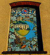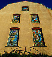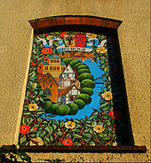 Public art has been used to celebrate twin town links, for instance in the form of seven mural paintings in the centre of the town of Sutton, Greater London. The five main paintings show a number of the main features of the London Borough of Sutton and its four twin towns, along with the heraldic shield of each above the other images. Each painting also features a plant as a visual representation of its town's environmental awareness.[39] In the case of Sutton this is in a separate smaller painting (above its main one) showing a beech tree, intended as a symbol of prosperity and from which Carshalton Beeches in the borough derives its name.[40]