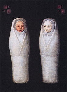 A painting known as the De Wikkelkinderen (The Swaddled Children), from 1617, is thought to represent a depiction of TTTS.[13] The drawing shows twins that appear to be identical, but one is pale (possibly anemic), while the other is red (possibly polycythemic). Analysis of the family histories of the owners of the painting suggests that the twins did not survive to adulthood, although whether that is due to TTTS is uncertain.