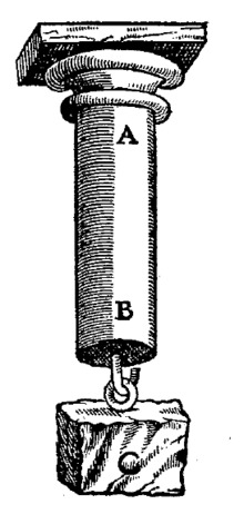 [56] The first example is a hemp rope which is constructed from small fibres which bind together in the same way as a rope round a windlass to produce something much stronger. Then the vacuum that prevents two highly polished plates from separating even though they slide easily gives rise to an experiment to test whether water can be expanded or whether a vacuum is caused. In fact, Sagredo had observed that a suction pump could not lift more than 18 cubits of water and Salviati observes that the weight of this is the amount of resistance to a void. The discussion turns to the strength of a copper wire and whether there are minute void spaces inside the metal or whether there is some other explanation for its strength.