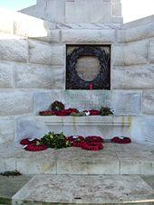The stone wall surrounding the cemetery makes-up the Tyne Cot Memorial to the Missing, one of several Commonwealth War Graves Commission Memorials to the Missing along the Western Front. The UK missing lost in the Ypres Salient are commemorated at the Menin Gate memorial to the missing in Ypres and the Tyne Cot Memorial. Upon completion of the Menin Gate, builders discovered it was not large enough to contain all the names as originally planned.[7] They selected an arbitrary cut-off date of 15 August 1917 and the names of the UK missing after this date were inscribed on the Tyne Cot memorial instead.[8] Additionally, the New Zealand contingent of the Commonwealth War Graves Commission declined to have its missing soldiers names listed on the main memorials, choosing instead to have names listed on its own memorials near the appropriate battles. Tyne Cot was chosen as one of these locations.[9] Unlike the other New Zealand memorials to its missing, the Tyne Cot New Zealand memorial to the missing is integrated within the larger Tyne Cot memorial, forming a central apse in the main memorial wall. The inscription reads: "Here are recorded the names of officers and men of New Zealand who fell in the Battle of Broodseinde and the First Battle of Passchendaele October 1917 and whose graves are known only unto God".[10]