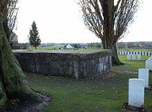 The name "Tyne Cot" is said to come from the Northumberland Fusiliers, seeing a resemblance between the many German concrete pill boxes on this site and typical Tyneside workers' cottages (Tyne cots).[2] Tyne Cot CWGC Cemetery lies on a broad rise in the landscape which overlooks the surrounding countryside. As such, the location was strategically important to both sides fighting in the area. The concrete shelters which still stand in various parts of the cemetery were part of a fortified position of the German Flandern I Stellung,[3] which played an important tactical role during the Battle of Passchendaele in 1917.