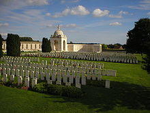 The Cross of Sacrifice that marks many CWGC cemeteries was built on top of a German pill box in the centre of the cemetery, purportedly at the suggestion of King George V, who visited the cemetery in 1922 as it neared completion.[1] The King's visit, described in the poem The King's Pilgrimage, included a speech in which he said: