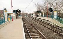 In March 2002, a £100 million extension, covering 11.5 miles (18.5 km), was opened from Pelaw to Sunderland and South Hylton.[9] The extension used part of the existing Durham Coast Line, with the line being adapted to allow a shared service between Metro and rail services – therefore becoming the first system in the United Kingdom to implement a form of the Karlsruhe model.[4] Between Pelaw and Sunderland, intermediate stations at Brockley Whins, East Boldon and Seaburn were re-built, with a further three being purpose-built for the network, at Fellgate, Stadium of Light and St. Peter's. Between Sunderland and South Hylton, around 3 miles (4.8 km) of the former Penshaw-Sunderland line, which closed to passenger traffic in May 1964, was used as the alignment of the route. Five purpose-built stations at Park Lane, University, Millfield, Pallion and South Hylton were constructed for the network.[2][25]