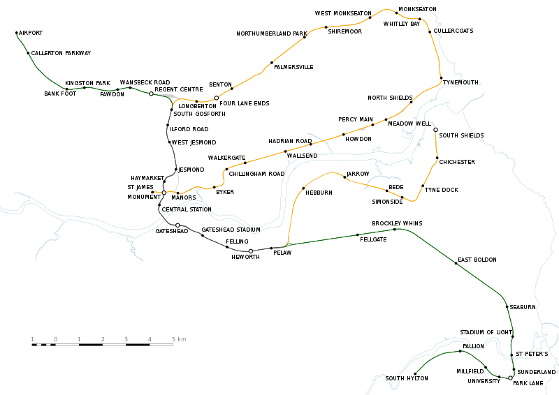 The Tyne and Wear Metro is a light rail rapid transit system serving Newcastle upon Tyne and the surrounding area including Gateshead, North Tyneside, South Tyneside, Sunderland and Newcastle International Airport. The network opened in stages from August 1980, and now serves a total of 60 stations, with two lines covering 48.2 miles (77.6 km) of track.[3][4][5][2]