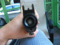 To gain the superior hitting power of the larger 7.7mm cartridge, several caliber 6.5mm Type 38 rifles were modified for the new round. Although the tests proved satisfactory, the army decided that the added recoil and larger chambering for the 7.7mm cartridge would require an entirely new rifle to be built for the cartridge.[2] It utilized a cock-on-closing action and an unusual safety mechanism, operated by pressing in the large knurled disk at the rear of the bolt with the palm of the hand and rotating it in a 1/8 clockwise turn, which is often misunderstood by Western shooters who are used to the Mauser's thumb lever safety. It featured a quick-release bolt and antiaircraft sights, as well as a sliding bolt cover and monopod. As a bolt-action rifle, the Type 99 was a very solid weapon, but as with all manually operated rifles used during World War II, they were in most close combat situations outclassed by semi-automatic rifles and submachine guns.