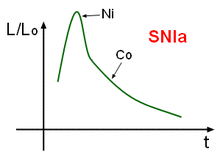 Type Ia supernovae have a characteristic light curve, their graph of luminosity as a function of time after the explosion. Near the time of maximal luminosity, the spectrum contains lines of intermediate-mass elements from oxygen to calcium; these are the main constituents of the outer layers of the star. Months after the explosion, when the outer layers have expanded to the point of transparency, the spectrum is dominated by light emitted by material near the core of the star, heavy elements synthesized during the explosion; most prominently isotopes close to the mass of iron (iron-peak elements). The radioactive decay of nickel-56 through cobalt-56 to iron-56 produces high-energy photons, which dominate the energy output of the ejecta at intermediate to late times.[14]