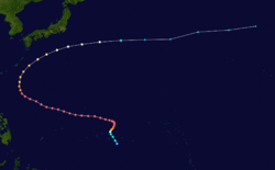 Typhoon Karen was the most powerful tropical cyclone to strike the island of Guam, and has been regarded as one of the most destructive events in the island's history.[1] It was first identified as a tropical disturbance on November 6, 1962, well to the southeast of Truk. Over the following two days, the system tracked generally northward and quickly intensified. Karen became a tropical storm late on November 7, and within two days it explosively intensified into a Category 5-equivalent super typhoon on the Saffir–Simpson scale. Turning westward, the typhoon maintained its intensity and struck Guam with winds of 280 km/h (175 mph) on November 11. Once clear of the island, it strengthened slightly and reached its peak intensity on November 13 with winds of 295 km/h (185 mph) and a barometric pressure of 894 mb (hPa; 26.40 inHg). The storm then gradually turned northward as it weakened, brushing the Ryukyu Islands on November 15, before moving east-northeastward over the open waters of the Pacific. Karen continued to weaken and transitioned into an extratropical cyclone on November 17 before losing its identity the following day between Alaska and Hawaii.
