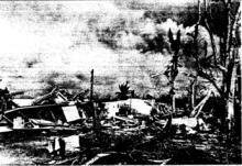 George Washington High was destroyed. The Tumon Junior Senior High School, although severely damaged, was re-opened within a month. Guam Memorial Hospital and the island's public works department were extensively damaged.[10] Downtown Hagåtña, Guam's largest city, was flattened.[17] Along the city's main road, Marine Drive, 20 cm (8 in) of sand accumulated from Karen's storm surge.[9] Overall, the city was 85 percent destroyed, while the villages of Yona and Inarajan were 97 and 90 percent destroyed, respectively.[18] Additionally, Agana Heights and Sinajana were reportedly leveled.[9] The communication network on the island was completely destroyed as antennas and transmission equipment were blown away.[10] Approximately 30 percent of telephone poles between the island's naval station and Nimitz Hill and 95 percent of civilian telephone poles were downed.[19] The power grid was also destroyed.[20] The Guam portion of the Pacific Scatter Communications System suffered extensive damage, with all four 61 m (200 ft) antennas at Ritidian Point being reduced to a "mess of tangled, twisted steel and cable." Losses from the antennas alone reached $1 million.[21] All airstrips on the island were rendered inoperable, hampering initial relief efforts.[22] Numerous roads across the island were also impassable, covered by downed trees and smashed vehicles.[17] The wreckage left in the wake of the storm was described as a "massive junkyard".[23]