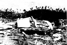 Surveys of damage revealed belt-like damage patterns from the winds, with some homes being leveled and others nearby having only minor damage, akin to the impacts of tornadoes.[13] The winds uprooted and snapped palm trees across the island and, in some instances, stripped the bark of tree trunks and branches as if they had been sandblasted.[1] Vegetation was completely defoliated across central areas of the island. In some places, it was described as the aftermath of a forest fire.[13] The winds also blew debris across the island. Metal roofing was found wrapped around trees.[9] In one instance, a twin-engine aircraft was carried 2.4 km (1.5 mi) from the hangar it was tied down in. A metal sign bolted into a warehouse was tossed 3.7 km (2.3 mi) and found half-buried in the ground.[13] Elsewhere, a quonset hut was lofted and carried for 125 m (411 ft), intact, before being crushed on impact.[4] Along the coast, USS Arco was torn from her moorings, severing two anchors and shearing a cleat – tested for over 23,000 and 45,000 kg (50,000 and 100,000 lb), respectively – in the process.[4][13] ROK Han Ra San and RPS Negros Oriental sank in the inner harbor of Guam.[15]