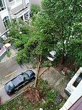 The tail front of Lekima stretched south to Malaysia and struck the northern states of the Malay Peninsula on August 9, which killed a person, left one missing while injuring ten others in the states of Kedah, Penang and Perak.[50] The storm also caused damage to 329 schools, and the damage was about RM20 million (US$4.77 million). Wind speeds in some areas were recorded at 100 km/h (62 mph). Hundreds of trees were uprooted.[51] 1,358 houses in Kedah were damaged by Lekima.[52] Total damage in Malaysia reached RM60.2 million (US$14.4 million).[53]