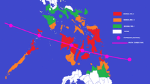 Maximum storm alerts were raised across the central Philippines, with lower warnings issued for the southern tip of Luzon. Authorities advised coastal residents to move to higher ground in Samar, and Leyte islands, as well as the northern region of Mindanao.[10] The Philippine Airlines cancelled 59 domestic flights from Manila and Cebu,[11] but international flights were unaffected.[10] Schools were called off in northern Mindanao[12] and domestic shipping services were temporarily cancelled.[13]