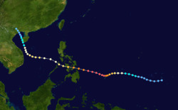After turning west-northwest in the general direction of the central Philippines, Mike leveled off in intensity. Land interaction took toll on the typhoon on November 12 as cloud top temperatures surrounding the eye warmed and the eye became increasingly cloud-filled, coinciding with a weakening trend. Later that day, the typhoon made landfall[2] on the Cebu province,[8] with the JTWC and JMA reporting winds of 225 km/h (140 mph) and 160 km/h (100 mph) respectively.[5] The system maintained typhoon intensity over the island chain.[3][7] After Mike entered the South China Sea, the JTWC and many tropical cyclone forecast models anticipated that the typhoon would strike into Vietnam, but this did not occur. Slight re-strengthening occurred over the open waters in the South China Sea.[2] On November 14, the JMA reported that Mike reached a secondary peak intensity of 135 km/h (85 mph) while the JTWC estimated a secondary maximum intensity of 160 km/h (100 mph).[5] The next day, Typhoon Mike turned north-northwest in response to a weakness in the subtropical ridge. Increased vertical wind shear induced a weakening trend,[2] and midday on November 15, the JMA downgraded Mike to a severe tropical storm.[3] Twenty-four hours later, the JTWC downgraded Mike to a tropical storm as its structure became less organized.[2] Later on November 16, Mike passed over the western portion of Hainan Island, and after briefly tracking through the Gulf of Tonkin, Mike moved inland over Quảng Ninh, Vietnam as a tropical depression. Overland, Mike rapidly dissipated;[9] both the JTWC and the JMA ceased tracking the system on November 18.[5]