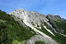 Mount Sulzfluh is well frequented by climbers and is situated in the Rätikon range of the Alps, on the border between Austria and Switzerland. On the eastern side is a mountain path, of grade T4,[5] allowing non-climbers to reach the 2817 metre summit. There are six known caves in the limestone mountain, with lengths between 800 and 3000 or more yards, all with entrances on the Eastern side, in Switzerland.[6]
