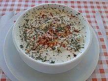 Tzatziki, cacık (Turkish pronunciation: [dʒaˈdʒɯk]), or tarator is a dip, soup, or sauce found in the cuisines of Southeast Europe and the Middle East. It is made of salted strained yogurt or diluted yogurt[1] mixed with cucumbers, garlic, salt, olive oil, sometimes with vinegar or lemon juice, and herbs such as dill, mint, parsley and thyme.[2][3][4] It is generally served as a cold appetizer (meze) or a side dish.
