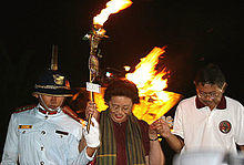 On January 8, 2008, the University of the Philippines began its centennial celebration. The opening ceremony featured a 100-torch relay[25] to light the eternal flame on the Centennial Cauldron at Quezon Hall. Torches were carried by, among others, Fernando Javier, 100, of Baguio, the oldest U.P. alumnus (Civil Engineering from University of the Philippines Manila, 1933), Michael Dumlao, a 6th-grader from the University of the Philippines Integrated School in U.P. Diliman and U.P. President Emerlinda Roman, the first woman president of the university.[26] The Centennial Cauldron features three pillars to represent the three core values, and seven flowers representing the seven constituent universities, i.e. U.P. Manila, U.P. Diliman (together with U.P. Pampanga, its extension campus), U.P. Los Baños, U.P. Baguio, U.P. Visayas, U.P. Mindanao, and U.P. Open University.[27]