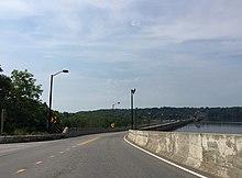 US 1 continues northeast as Conowingo Road through farmland. The old alignment of US 1, Forge Hill Road, splits to the east in Kalmia and rejoins the present highway 3 miles (4.8 km) later after separate crossings of Deer Creek. The highway passes through a commercial strip around the intersection with MD 136 (Whiteford Road/Priestford Road) as US 1 passes to the south of Dublin. US 1 curves east at the intersection with MD 440 (Dublin Road). Smith Road, another old alignment of US 1, splits to the northeast as US 1 heads toward Darlington, where it meets MD 161 (Main Street) and MD 623 (Castleton Road). The highway passes a weigh station on the southbound side that serves both directions and heads straight over a series of hills, gaining climbing lanes in either direction. At Shuresville Road, US 1 curves to the northeast and crosses the Susquehanna River on top of Conowingo Dam, a hydroelectric dam owned by Exelon, into Cecil County.