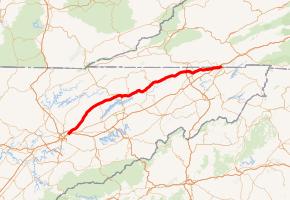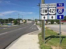 U.S. Route 11W (US 11W), locally known as Bloody 11W,[4] is a divided highway of US 11 in the U.S. states of Tennessee and Virginia. The U.S. Highway, which is complemented by US 11E to the south and east, runs 111.2 miles (179.0 km) from US 11, US 11E, and US 70 in Knoxville, Tennessee north and east to US 11, US 11E, US 19, and US 421 in Bristol, Virginia. US 11W connects Knoxville and the twin cities of Bristol, Virginia and Bristol, Tennessee with the East Tennessee communities of Rogersville and Kingsport. The U.S. Highway has an unsigned concurrency with Tennessee State Route 1 (SR 1) for its whole length.