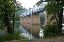 In November 1936, MDSRC put together a plan to replace the Potomac River bridges at Hancock, Shepherdstown, and Point of Rocks.[28] The Point of Rocks Bridge became the first of the three crossings to be started when construction began March 25, 1937; the bridge's concrete piers were completed and the piers of the old bridge were removed from the river by September of that year.[29] The new bridge and its approaches, which crossed over the B&O Railroad on the Maryland side, opened December 26, 1937.[30] The camelback truss bridge spans 1,689 feet (515 m) and has a 24-foot-wide (7.3 m) roadway and a pair of 3-foot-wide (0.91 m) sidewalks. US 15 followed a temporary approach to the new bridge along Commerce Street that remained vulnerable to major floods.[22] The U.S. Highway was moved to higher ground on Clay Street when the highway was reconstructed and widened from Point of Rocks to Tuscarora in 1949.[31]