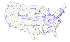 Though US 1 is generally considered to be the highway that runs alongside Interstate 95 (I-95), US 17 runs parallel to I-95 for much of its extent, and even shares the same physical road for short spans in Fredericksburg, Virginia, and Ridgeland, South Carolina. As such, US 17 is out of sequence in the U.S. Highway numbering plan (US 17 would, under the plan, run parallel to and between US 15 and US 19; the U.S. Highway following that path is instead marked US 219).