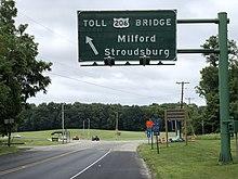 After crossing the river on the Milford-Montague Toll Bridge, US 206 continues north into Dingman Township in Pike County, Pennsylvania.[10] A short distance after the bridge, the route comes to a northbound toll plaza, where it becomes a two-lane divided highway.[3] US 206 officially ends at an intersection with US 209 not far after the toll plaza for the bridge.[3][10] Even though this intersection marks the end of US 206, a few signs show the route heading concurrent with US 209 to continue north to US 6 in Milford.[11]