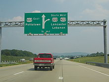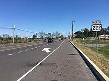 U.S. Route 222 (US 222) is a U.S. Highway that is a spur of US 22. It runs for 95 miles (153 km) from US 1 in Conowingo, Maryland to Interstate 78 (I-78)/Pennsylvania Route 309 (PA 309) in Dorneyville, Pennsylvania. US 222 is almost entirely in Pennsylvania, and serves as the state's principal artery between the Lancaster and Reading areas and the Lehigh Valley. US 222 heads north from US 1 in Conowingo and soon crosses from Maryland into Pennsylvania, continuing north through rural areas and passing through Quarryville and Willow Street before reaching Lancaster. The route passes through Lancaster on a one-way pair of city streets before becoming a freeway at US 30 north of the city. The US 222 freeway heads northeast, crossing US 322 in Ephrata and coming to an interchange with the Pennsylvania Turnpike (I-76). US 222 bypasses Reading to the west, where it meets US 422. The freeway section ends past Reading and the route continues northeast through rural areas, with a freeway bypass of Kutztown. US 222 bypasses Trexlertown on a multilane divided expressway before coming to its northern terminus at I-78/PA 309 in Dorneyville, where the US 222 right-of-way continues into Allentown as PA 222.