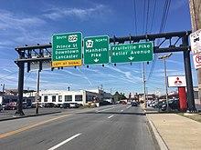 In 1995, construction began on the Park Road Corridor to connect US 222/US 422 at the junction of the West Shore Bypass and Warren Street Bypass to the Road to Nowhere.[43] Construction of the Park Road Corridor was completed in October 1998. As a result, US 222 was shifted to follow the Park Road Corridor and the Road to Nowhere to bypass the Reading area, replacing SR 3055 along the Road to Nowhere. The former alignment of US 222 that was bypassed became PA 12 along the Warren Street Bypass between US 222/US 422 and US 222 Bus. and a northern extension of US 222 Bus. along 5th Street Highway and Allentown Pike through Muhlenberg Township.[66] In 1998, construction began on the US 222 freeway bypass of Reading between PA 724 and US 422; this section of road opened in 2000. Construction began in 2001 on the US 222 freeway between Grings Hill Road and PA 724 while construction of the section between the Lancaster County border and Grings Hill Road started in 2003.[43] In 2004, construction was completed on the section of the US 222 freeway between Grings Hill Road and PA 724. As a result, US 222 was shifted to follow the new freeway between Grings Hill Road and US 422 and run concurrent with US 422 on the Warren Street Bypass north to the interchange with the West Shore Bypass and PA 12. The former alignment of US 222 along Lancaster Avenue became a southern extension of US 222 Bus.[43][67] In June 2006, the US 222 freeway was completed between the Lancaster County border and Grings Hill Road; marking the completion of the US 222 freeway between Lancaster and Reading.[43]