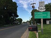 U.S. Route 360 (US 360) is a spur of US 60 in the U.S. state of Virginia. The U.S. Highway runs 225.31 miles (362.60 km) from US 58 Business, Virginia State Route 293 (SR 293), and SR 360 in Danville east to SR 644 in Reedville. US 360 connects Danville, South Boston, and Keysville in Southside Virginia with the state capital of Richmond. The U.S. Highway also connects Richmond with Tappahannock on the Middle Peninsula and the eastern Northern Neck, where the highway serves as the primary route through Northumberland County. US 360 is a four-lane divided highway for almost all of its length.