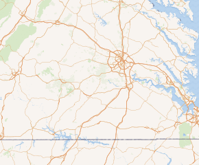 US 360 parallels Norfolk Southern's Richmond District rail line northeast from Burkeville. The highway meets the northern end of SR 49 (Watsons Wood Road) before entering Amelia County. West of Jetersville, the highway intersects the eastern end of SR 307 (Holly Farms Road), which connects to US 460 northwest of Burkeville. US 360 continues to Amelia Court House, which is directly served by US 360 Business (Goodes Bridge Road). North of the county seat, the U.S. Highway crosses the rail line and has a partial cloverleaf interchange with its business route before receiving the northern end of the business route west of Winterham, where the highway and railroad diverge. US 360 has a junction with SR 153 (Military Road) between Winterham and the Appomattox River, where the highway enters Chesterfield County. US 360 becomes Hull Street Road and passes through the village of Skinquarter before entering the suburban area surrounding Richmond. The U.S. Highway expands to eight lanes through Woodlake and crosses Swift Creek just downstream from the dam that holds back Swift Creek Reservoir west of the highway's cloverleaf interchange with SR 288.[1][2]